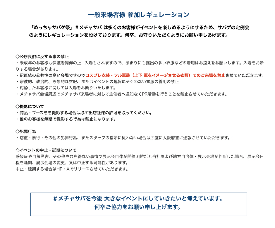 A メチャサバの会場は駅直結のイベント会場で一般のお客様の往来もあるため、コスプレや軍装、また18歳未満のお客様もいらっしゃるため露出の多い際どい衣装での入場はできません。(入場をお断りする場合があります)